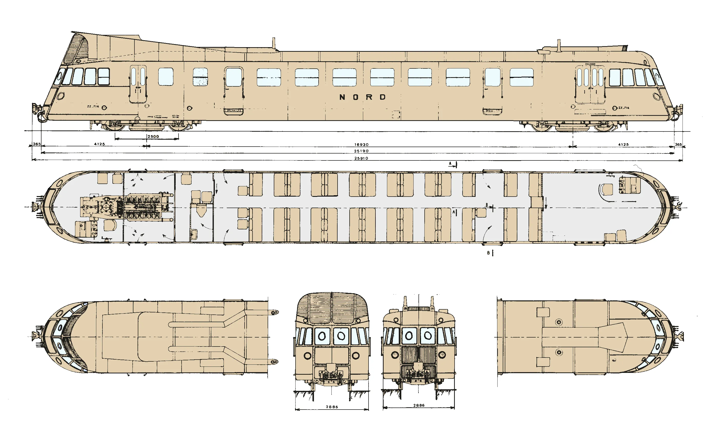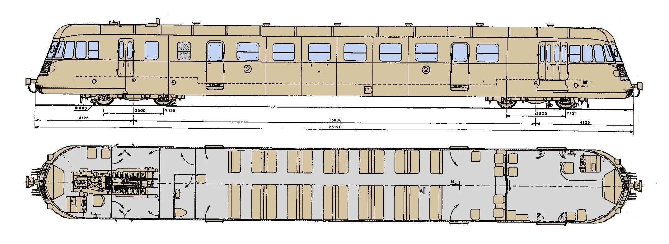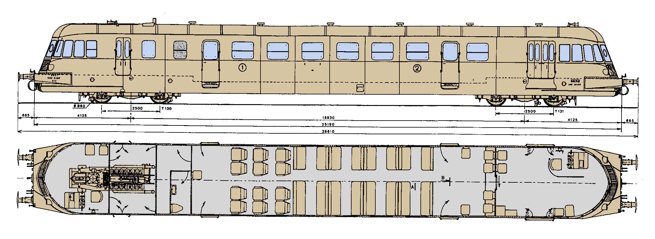 Les dispositions des sièges peuvent varier selon les demandes des compagnies : quatre ou cinq sièges de front, banquettes dos à dos ou sièges séparés, etc. Il est ainsi possible de loger de 48 à 70 voyageurs selon les politiques commerciales des compagnies. Un compartiment postal et un compartiment à bagages complètent l'équipement de l'ABJ et font de lui un train complet.